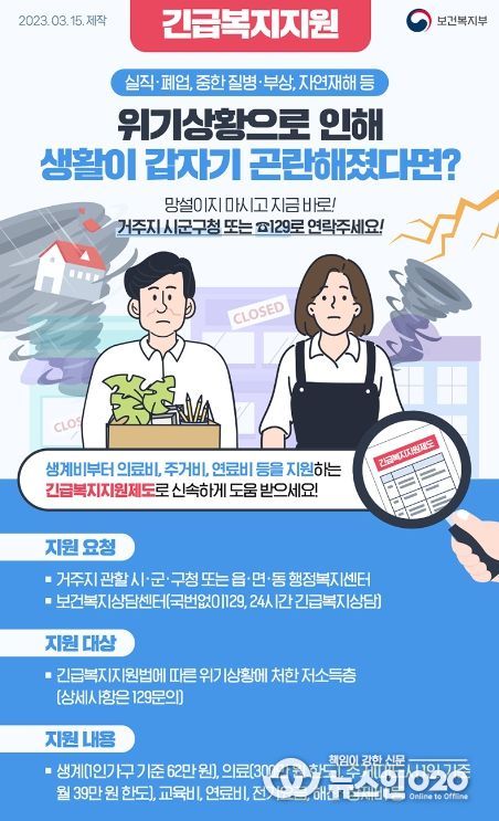 (뉴스인020 = 김나현 기자) 실직·폐업, 중한 질병·부상, 자연재해 등 위기상황으로 인해 생활이 갑자기 곤란해졌다면?