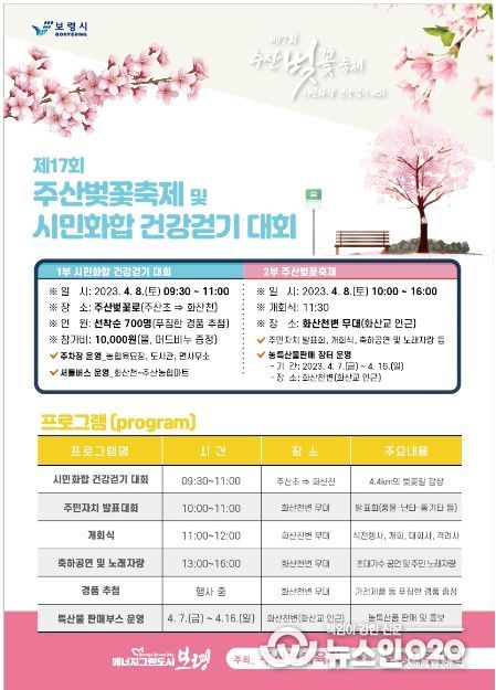 보령시는 오는 8일 오전 주산면체육회(회장 우희열) 주최로 주산면 화산천변 및 벚꽃길 일원에서‘제17회 주산벚꽃축제’가 열린다.