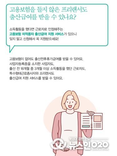 (뉴스인020 = 김나현 기자) 소득활동을 했다면 근로자로 인정해주는 고용보험 미적용자 출산급여 지원 서비스가 있으니 잊지 말고 신청해서 꼭 지원받으세요!