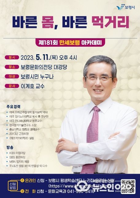 (뉴스인020 = 최정직 기자) 보령시는 오는 11일 오후 4시 보령문화의전당 대강당에서 이계호 교수를 초빙해 ‘바른 몸, 바른 먹거리’라는 주제로 제181회 만세보령 아카데미 강연을 개최한다.
