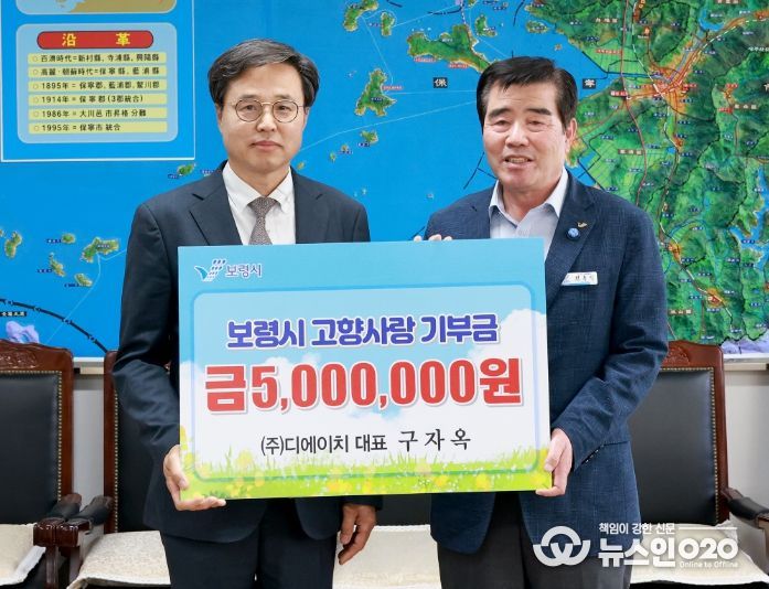 (뉴스인020 = 최정직 기자) 보령시는 지난 15일 시장실에서 김동일 시장과 ㈜디에이치 구자옥 대표가 참석한 가운데 고향사랑기부금 500만 원 전달식을 개최했다.