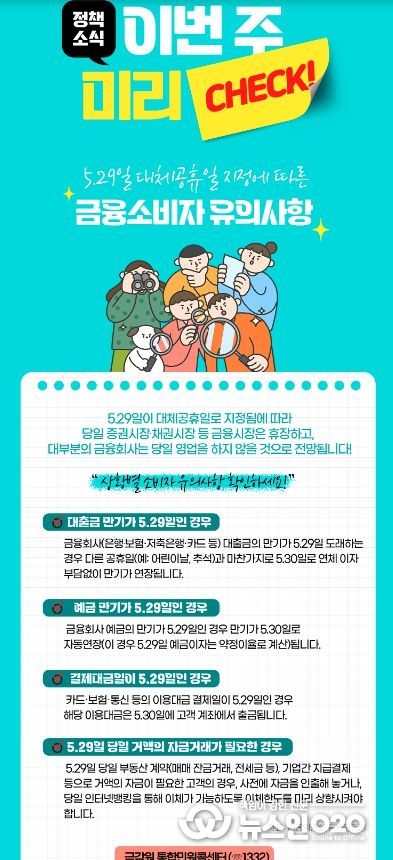 (뉴스인020 = 김나현 기자) 5월 29일이 대체공휴일로 지정됨에 따라 당일 증권시장·채권시장 등 금융시장은 휴장하고, 대부분의 금융회사는 당일 영업을 하지 않을 것으로 전망되어 금융소비자가 사전에 준비해야 할 유의사항 등을 알려드립니다.