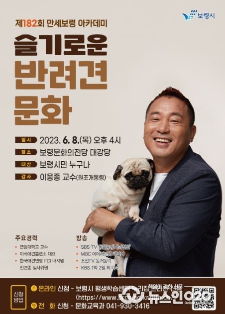(뉴스인020 = 최정직 기자) 보령시는 오는 8일 오후 4시 보령문화의전당 대강당에서 이웅종 교수를 초빙해 ‘슬기로운 반려견 문화’라는 주제로 제182회 만세보령 아카데미 강연을 개최한다.