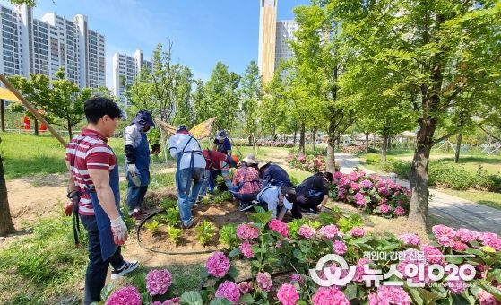 (뉴스인020 = 박용우 기자) ‘새빛수원 손바닥정원단’이 13일 방죽공원(망포동) 수국정원 조성공사에 참여했다.