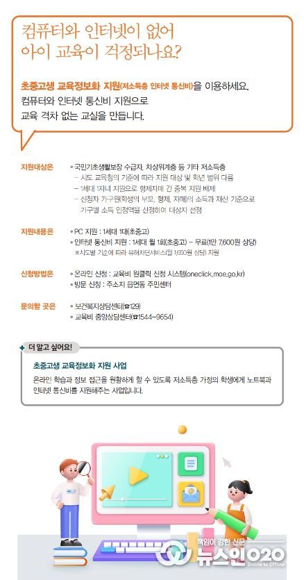 (뉴스인020 = 김나현 기자) 초중고생 교육정보화 지원(저소득층 인터넷 통신비)을 이용하세요.
