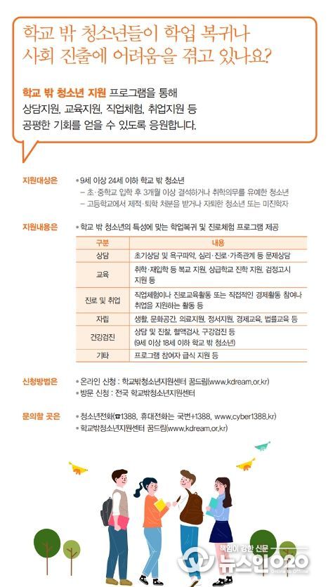 (뉴스인020 = 김나현 기자) 학교 밖 청소년 지원 프로그램을 통해 상담지원, 교육지원, 직업체험, 취업지원 등 공평한 기회를 얻을 수 있도록 응원합니다.