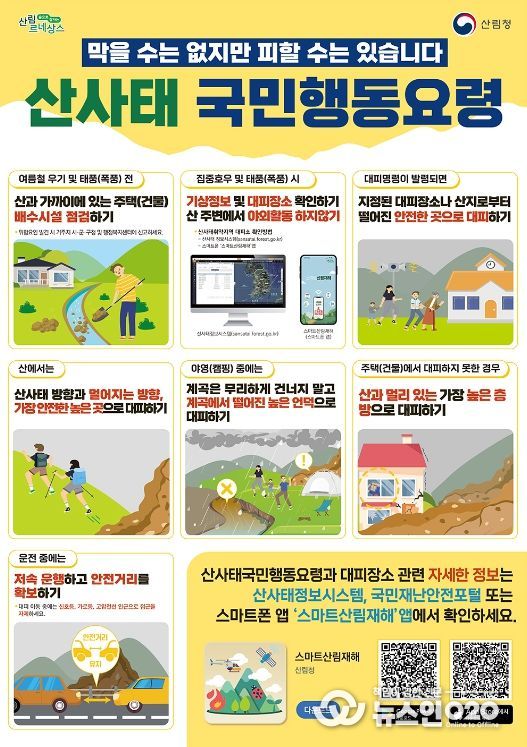 산사태국민행동요령과 대피장소 관련 자세한 정보는 산사태정보시스템, 국민재난안전포털 또는 스마트폰 ‘스마트산림재해’앱에서 확인하세요.