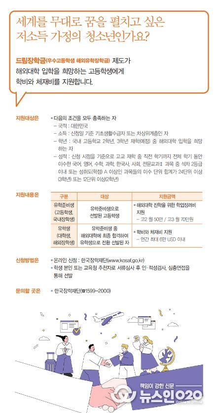 (뉴스인020 = 김나현 기자) 드림장학금(우수고등학생 해외유학장학금) 제도가 해외대학 입학을 희망하는 고등학생에게 학비와 체재비를 지원합니다.