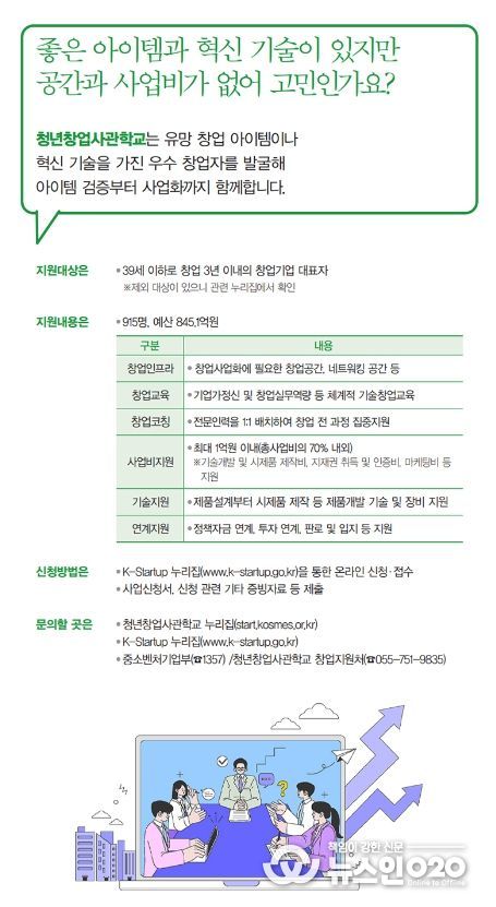 (뉴스인020 = 김나현 기자) 청년창업사관학교는 유망 창업 아이템이나 혁신 기술을 가진 우수 창업자를 발굴해 아이템 검증부터 사업화까지 함께합니다.