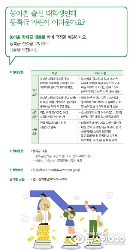 (뉴스인020 = 김나현 기자) 농어촌 학자금 대출로 학비 걱정을 해결하세요.