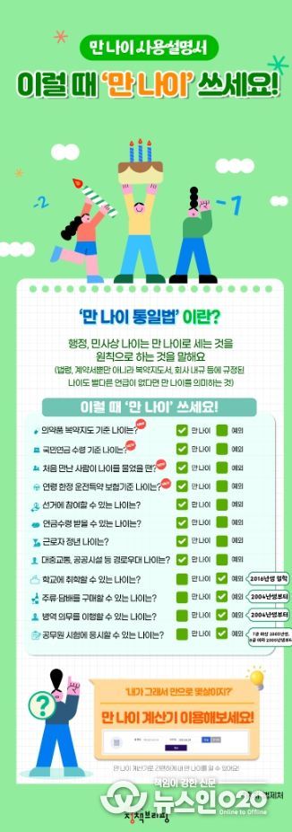 (뉴스인020 = 김나현 기자) 지난 6월 28일부터 법적·사회적 나이를 '만 나이'로 통일하는 제도가 시행되었어요.