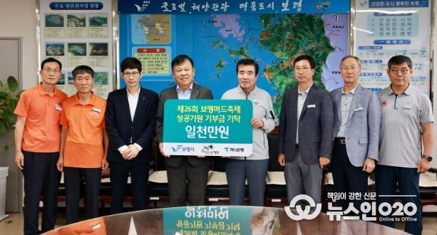 (뉴스인020 = 최정직 기자) 보령시는 17일 오전 시장실에서 김동일 시장과 김세용 하나은행 충남북영업본부 지역대표 등 관계자가 참석한 가운데 보령머드축제 후원금 전달식을 가졌다.