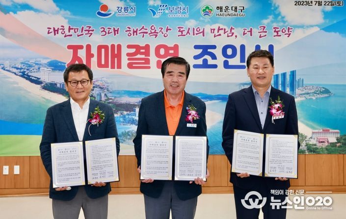 (뉴스인020 = 최정직 기자) 전국 3대 해수욕장으로 유명한 보령시와 강릉시, 해운대구는 22일 보령머드테마파크에서 김동일 보령시장과 김홍규 강릉시장, 김성수 해운대구청장, 관계 공무원 등 50여 명이 참석한 가운데 자매결연 조인식을 가졌다.
