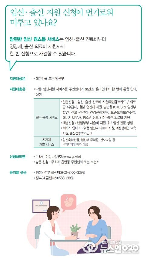 (뉴스인020 = 김나현 기자) 맘편한 임신 원스톱 서비스는 임신·출산 진료비부터 영양제, 출산 의료비 지원까지 한 번 신청으로 해결할 수 있습니다.