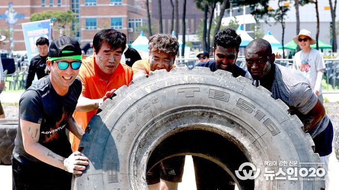 머드 챌린지는 극한상황에서 동료들과 호흡을 맞춰 장애물을 돌파하는 체험형 프로그램으로 △참호 머드 보물찾기 △300kg 타이어 옮기기 △1.5m 통나무 넘기 △머드바닥 누워서 통과하기 △언덕 넘어가기 등 10개 코스로 구성됐다.