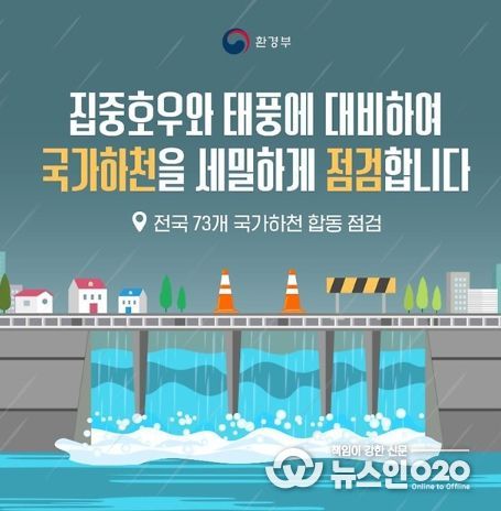 8월 이후 발생 가능한 집중호우와 태풍 등에 대비하여 전국 73개 국가하천의 제방 등 하천시설 취약요소에 대해 전문가 100여 명과 함께 국가, 지자체 합동으로 점검을 시행합니다.
