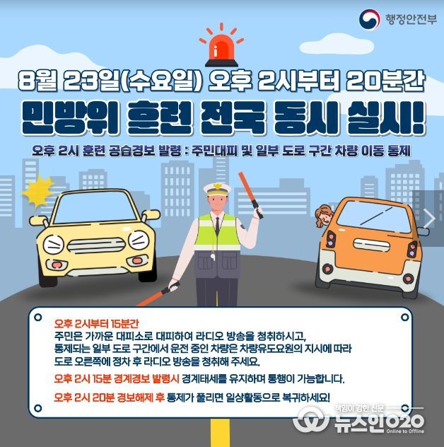 (뉴스인020 = 김나현 기자) 행정안전부는 적 공습 시 국민의 대응 역량을 강화하기 위해 오는 23일 오후 2시부터 20분 간 민방위 훈련을 전국 동시 실시합니다.