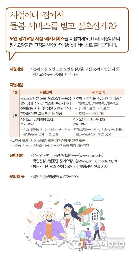 (뉴스인020 = 김나현 기자) 노인 장기요양 시설·재가서비스를 이용하세요. 65세 이상이거나 장기요양등급 판정을 받았다면 맞춤형 서비스로 돌봐드립니다.