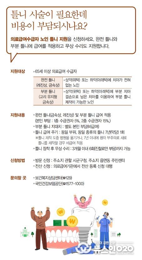 (뉴스인020 = 김나현 기자) 의료급여수급자 노인 틀니 지원을 신청하세요. 완전 틀니와 부분 틀니에 급여를 적용하고 무상 수리도 지원합니다.
