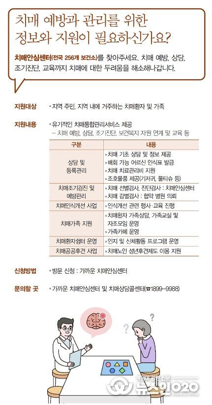 (뉴스인020 = 김나현 기자) 치매안심센터(전국 256개 보건소)를 찾아주세요. 치매 예방, 상담, 조기진단, 교육까지 치매에 대한 두려움을 해소해나갑니다.