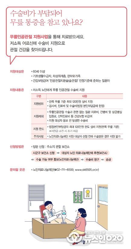(뉴스인020 = 김나현 기자) 무릎인공관절 지원사업을 통해 치료받으세요.