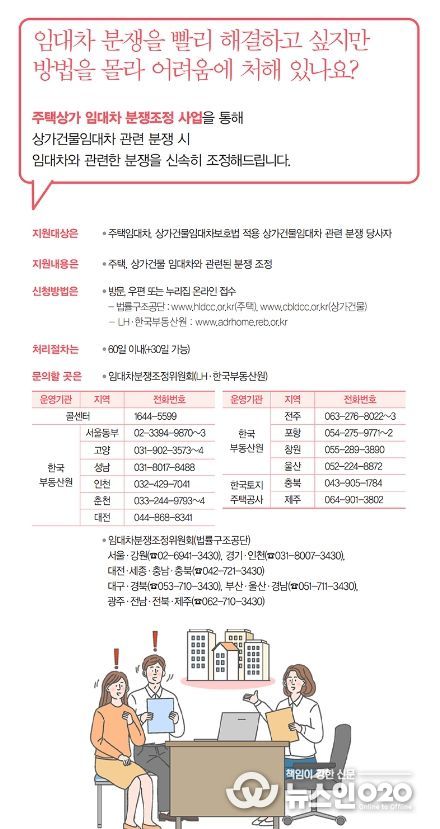(뉴스인020 = 김나현 기자) 주택상가 임대차 분쟁조정 사업을 통해 상가건물임대차 관련 분쟁 시 임대차와 관련한 분쟁을 신속히 조정해드립니다.
