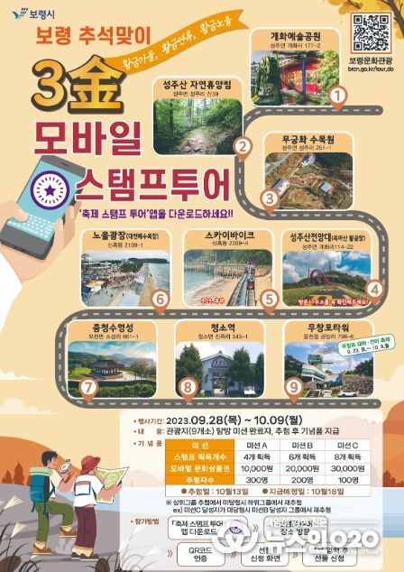 시는 9월 28일부터 10월 9일까지 12일간 보령의 대표 관광지 9곳을 방문하면 기념품을 제공하는 ‘추석맞이 3金 모바일 스탬프투어’ 이벤트를 진행한다.