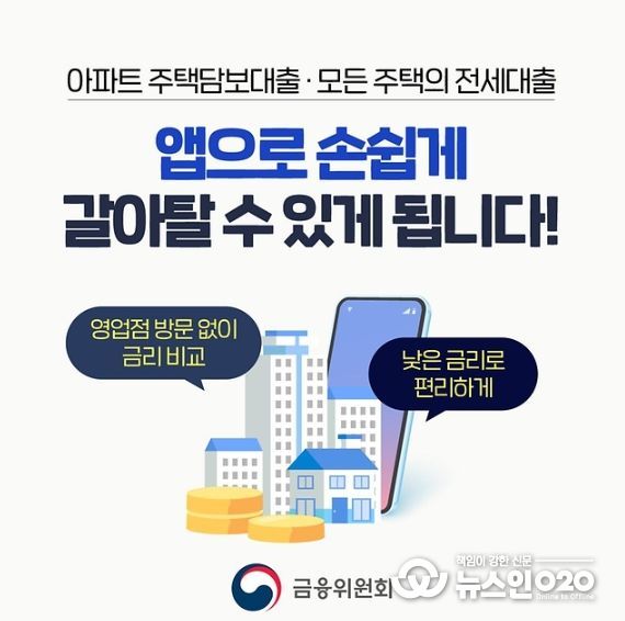 (뉴스인020 = 김나현 기자) 아파트 주택담보대출과 모든 주택의 전세대출을 받은 금융소비자도 대환대출 인프라를 이용해 금리를 비교하여, 낮은 금리로 편리하게 갈아탈 수 있게 됩니다!