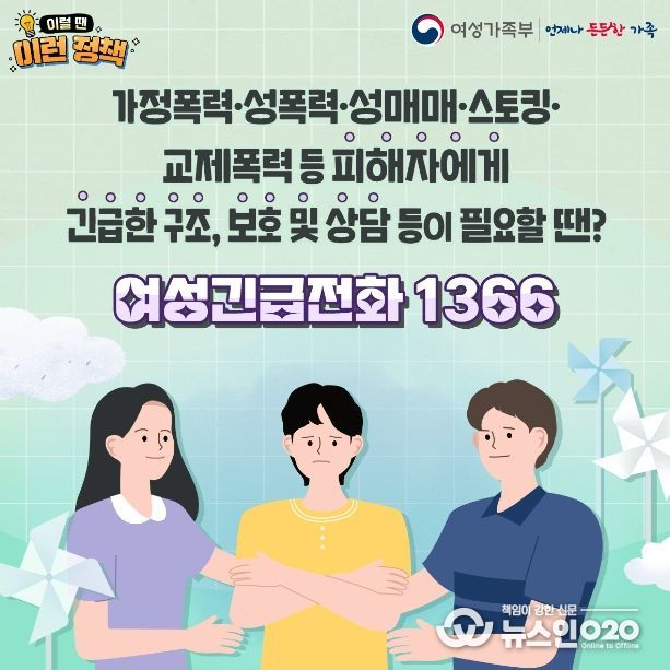 (뉴스인020 = 김나현 기자) 가정폭력·성폭력·성매매·스토킹·교제폭력 등 피해자에게 긴급한 구조·보호 및 상담 등이 필요할 땐?