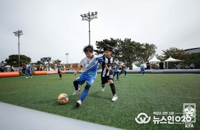축구 경기는 15m x 20m의 규격의 에어피치에서 진행됐다. 이는 지역별 축구 인적 인프라 격차를 해소하기 위해 스몰사이즈 경기를 시범 도입했다. 작은 공간에서 진행됐지만, 아이들은 치열한 경기를 펼치며 승부욕을 보여줬다. 7일 열린 U-10 경기는 총 21팀이 참여했으며, 경기 시간은 10분이었다. 경기는 4인제로 진행됐고, 종종 여자아이들과 남자아이들이 함께 경기하는 재밌는 모습도 눈에 띄었다.