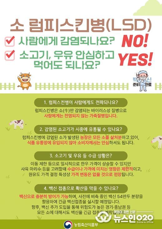 럼피스킨병에 감염된 소가 발생된 농장은 모든 소를 살처분하고 있어, 식품 유통망에 유입되지 않아 소비자께서는 안심하셔도 됩니다.