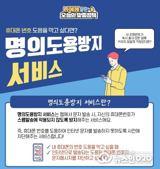 (뉴스인020 = 김나현 기자) 최근 남의 명의로 휴대전화를 불법 개통하거나 불법문자 발송에 다른 사람의 번호를 악용하는 등 휴대전화 명의·번호 도용 사례가 빈번히 발생하고 있는데요. 과학기술정보통신부가 이통3사와 손잡고 ‘명의도용방지 서비스’를 제공합니다. 모바일로 내 명의의 휴대전화 개통 현황을 실시간으로 확인할 수 있고, 서비스 신청 즉시 번호도용 차단이 가능합니다. 지금 바로 이용해 보세요!