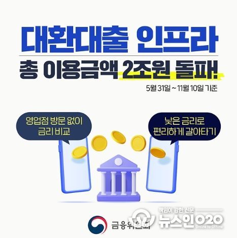 (뉴스인020 = 김나현 기자) 스마트폰으로 손쉽게 낮은 금리의 대출로 갈아탈 수 있는 대환대출 인프라 총 이용금액이 2조원을 돌파했습니다!