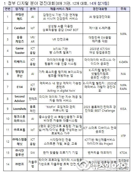 ‘제2회 K-디지털 그랜드 챔피언십’은 전년 대비 지역 디지털 경진대회를 연계하는 등 규모를 확대하여, 정부․공공기관 디지털 경진대회 우승자 14팀, 민간 창업경진대회 우승자 10팀, 권역별(충청·동북·동남·호남) 지역 디지털 경진대회 우승자 4팀 등 총 28개 팀이 참가했다. 또한, 아세안 경진대회에서 우승한 3팀이 참여하는 글로벌 세션과 및 기조 강연을 추가했으며, 챔피언십 수상팀에 대한 후속지원도 더욱 강화했다.