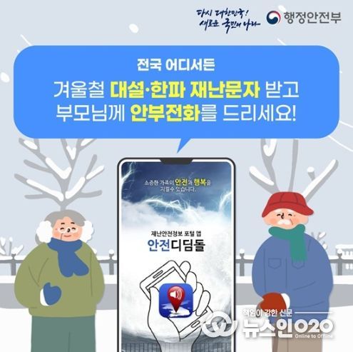 (뉴스인020 = 김나현 기자) 전국 어디서든 겨울철 대설·한파 재난문자 받고 부모님께 안부전화를 드리세요!