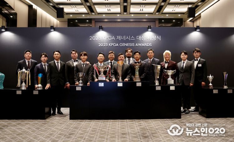 (뉴스인020 = 김민석 기자) 27일 서울 용산구 소재 그랜드하얏트 서울 그랜드볼룸에서 2023 시즌 KPGA 코리안투어의 피날레를 장식하는 자리인 ‘2023 KPGA 제네시스 대상 시상식’ 행사를 앞두고 포토콜이 진행됐다.