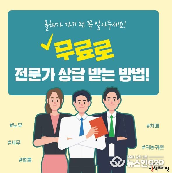 (뉴스인020 = 김나현 기자) 일상 생활에서 전문가의 도움이 필요한 경우가 많은데요. 하지만 경제적 이유나 상황에 맞는 전문가를 찾지 못해 상담을 받지 못하는 일도 많습니다. 법률, 세무, 노무, 치매, 귀농귀촌 등의 분야에서 전문가의 심도 깊은 상담을 받을 수 있는 방법을 소개합니다!