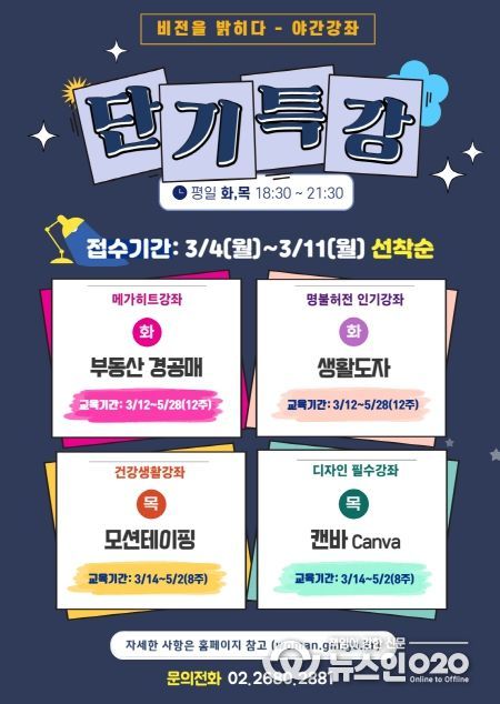 (뉴스인020 = 이한영 기자) 광명시 여성비전센터는 3월 11일까지 야간 단기특강 ‘비전을 밝히다’ 수강생을 모집한다.
