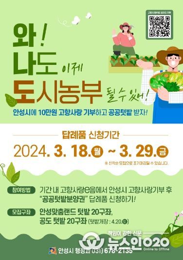 (뉴스인020 = 김성길 기자) 안성시가 오는 18일부터 고향사랑기부제를 통해 도시농업공동체 공공텃밭을 가꿀 도시농부를 모집한다고 밝혔다.