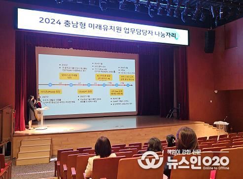 4월 23일 실시된 이번 나눔자리는 충남형 미래유치원 운영 업무담당자를 중심으로 연수와 협의회, 사업 안내 등으로 이루어졌으며 ▲유‧초 연계 인공지능교육 (홍남초등학교 교사 심민정) ▲인공지능 유치원 운영사례 (아해랑유치원 원감 정미진) ▲유‧초 연계 이음학기 교원 네트워크 (수덕초등학교병설유치원 교사 홍주희) 등의 나눔자리로 이루어졌다.