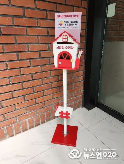 (뉴스인020 = 김성길 기자) 대야ㆍ신천행정복지센터는 개청 9주년을 맞아 시민의 작은 소리에도 귀 기울이고, 다양한 의견을 수렴하는 열린 소통 행정을 실현하고자 ‘시민의 소리함’을 운영한다.