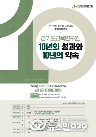 (뉴스인020 = 박용우 기자) 경기도교육연구원은 개원 11주년을 맞이해 ‘경기도교육연구원, 10년의 성과와 10년의 약속’을 주제로 포럼을 개최한다. 포럼은 10월 23일 14시 경기도교육연구원 대강당에서 개최되며 유튜브를 통해 실시간 생중계도 진행한다.