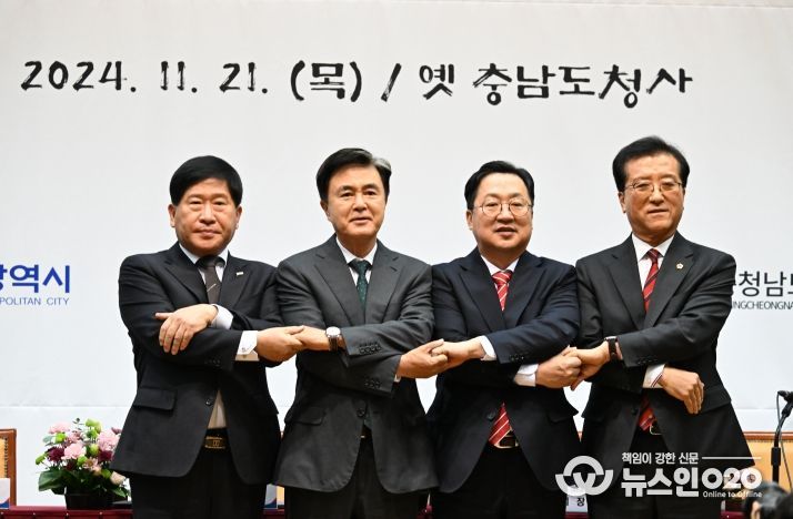김태흠 지사는 21일 대전 옛 충남도청사에서 이장우 대전시장, 홍성현 충남도의회 의장, 조원휘 대전시의회 의장과 통합 지방자치단체 출범 추진을 위한 공동선언문을 채택·발표했다.