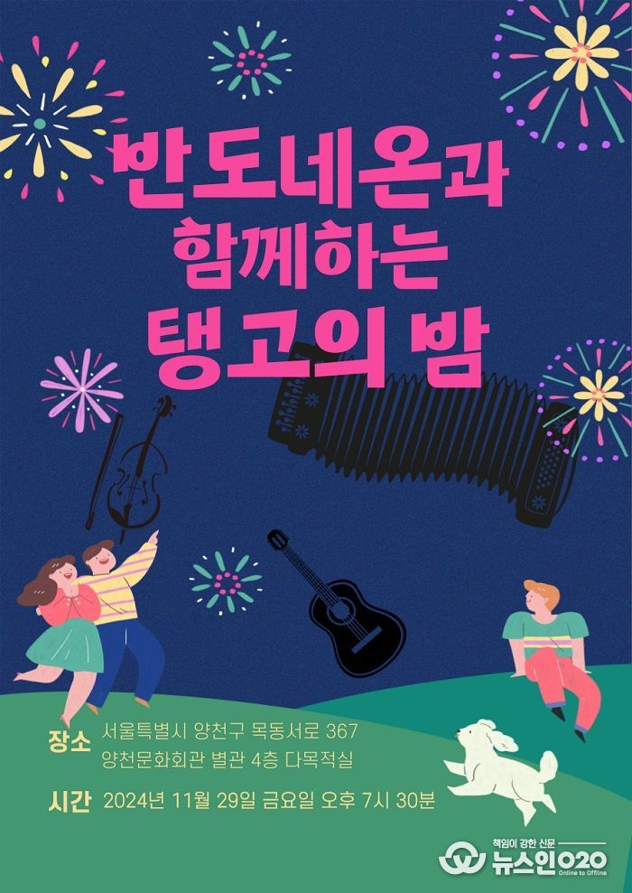 (뉴스인020 = 김성길 기자) 깊어가는 가을밤, 매혹적인 탱고 선율로 물들일 특별한 공연이 찾아온다. 반도네오니스트 최예슬은 오는 11월 29일 양천문화회관 별관 4층 다목적실에서 '반도네온과 함께하는 탱고의 밤' 공연을 개최한다.