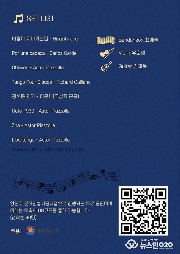 이번 공연은 양천구 문화진흥기금사업의 일환으로 기획됐으며, 최예슬이 직접 기획하여 바이올린, 클래식 기타와 함께 탱고 음악의 진수를 선보일 예정이다.