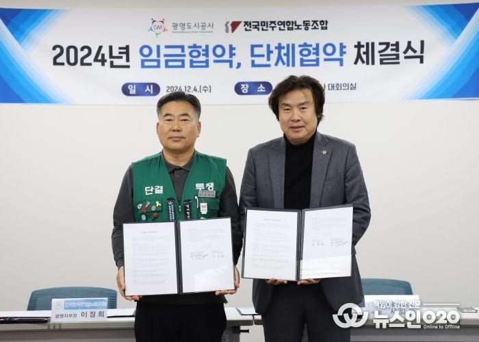 (뉴스인020 = 김성길 기자) 광명도시공사와 공사 교섭대표노조인 전국민주연합노동조합 광명지부와 노사 교섭위원들이 참석한 가운데 2024년 임금 및 단체협약을 체결했다.