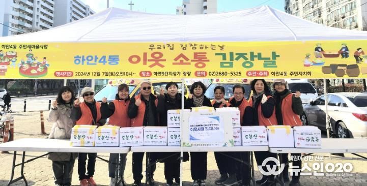 (뉴스인020 = 김성길 기자) 광명시 하안4동 주민자치회(회장 최미정)는 지난 7일 하안주공 9단지 상가 앞 광장에서 ‘이웃과 함께하는 김장김치 담가보기’를 진행했다.