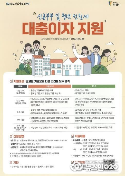 (뉴스인020 = 김성길 기자) 광명시가 주택가격 상승과 대출이자 증가로 인한 신혼부부와 청년의 주거비 부담을 낮추기 위해 신혼부부와 청년에게 전월세 대출이자를 지원한다.
