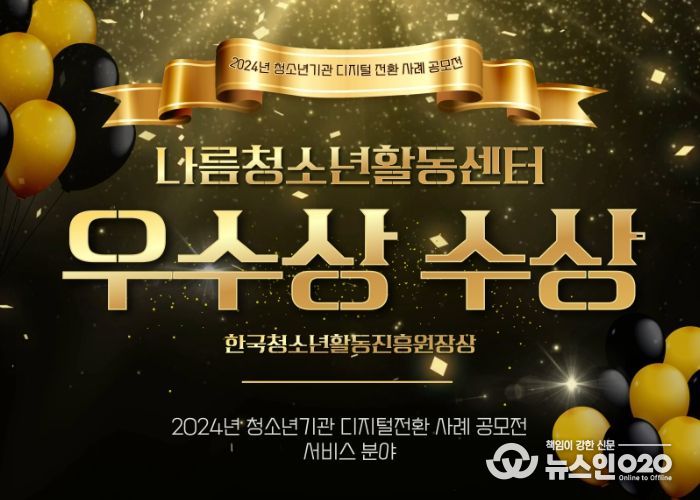 (뉴스인020 = 김성길 기자) 광명시청소년재단 나름청소년활동센터는 한국청소년활동진흥원에서 진행한 '2024년 청소년기관 디지털전환 사례 공모전'서비스 분야에 지원하여 우수상(한국청소년홛동진흥원장상)을 수여하는 쾌거를 이뤘다.