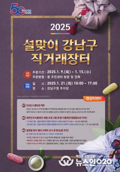 (뉴스인020 = 뉴스인020 기자) 꿈이 모이는 도시, 미래를 그리는 강남구가 설 명절을 맞아 오는 1월 21일 10시부터 17시까지 구청 주차장에서 ‘설맞이 직거래장터 및 친선도시 홍보관’을 개최한다.